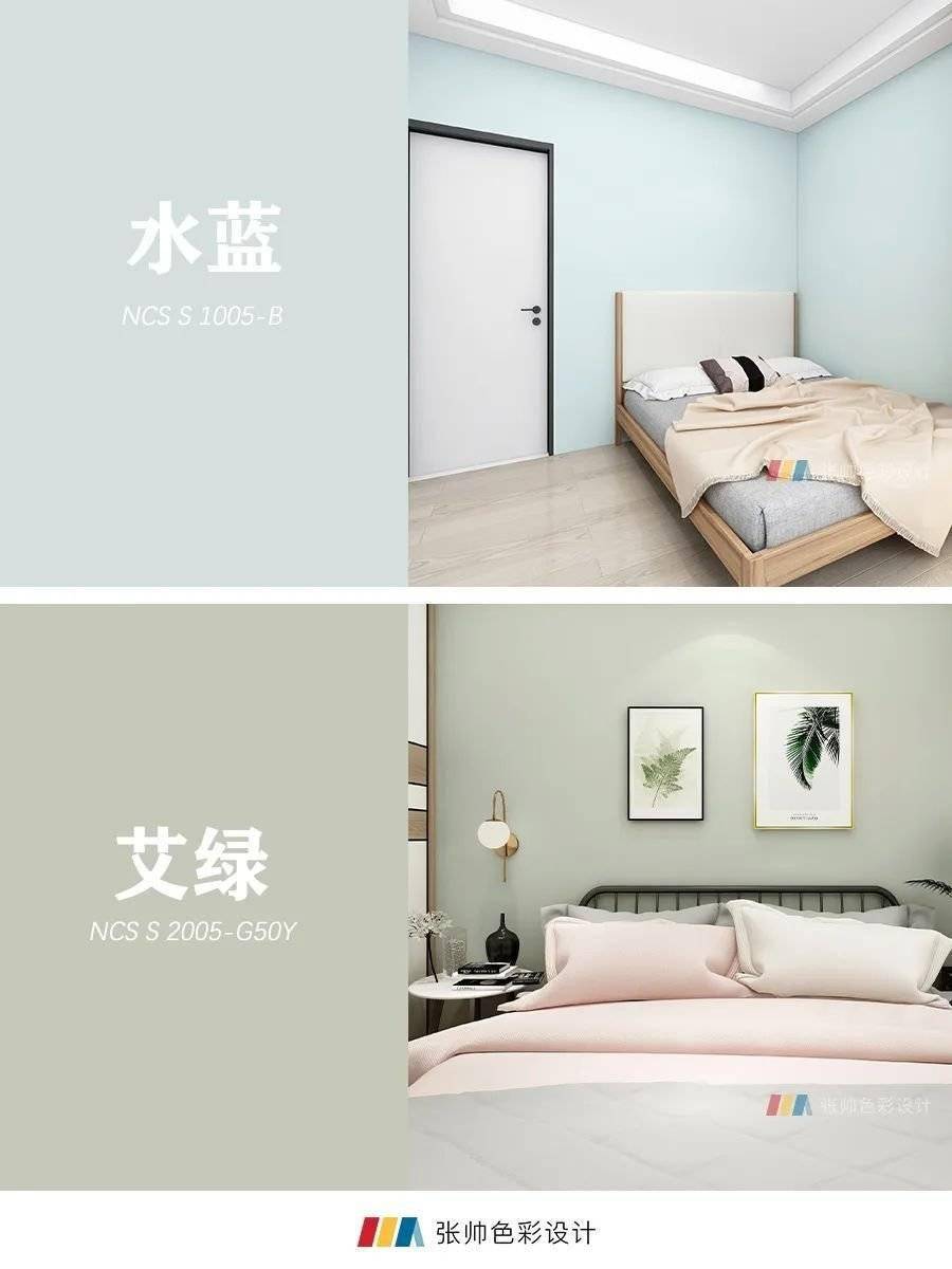 一組飽和度比較高的顏色,水藍色明亮開朗,適合用在浴室或者兒童房,小清新的艾綠搭配北歐風營造休閑舒適的臥室空間。